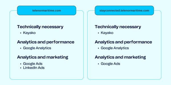 telenormaritime.com uses cookies to measure the traffic on our site, and gain insight for marketing purposes. A cookie is a small text file that is placed on the hard disk by a web page server. These cookies may collect information that, depending on their type, can be used to analyze usage patterns or deliver personalized marketing. We do not use cookies to directly identify you without your consent. You can manage your cookie preferences or withdraw consent at any time vie the Manage Cookies Consent (in bottom of webside).